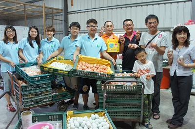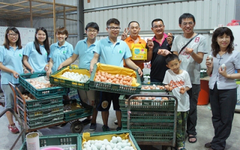 大三的蔡皓哲、王元勝、王惠鈴、劉雅涵、楊佳瑾,到竹塘鄉的梁欽牧場幫忙,他們捲起褲管、拉起衣袖,和老闆一起餵雞、撿雞蛋、分裝雞蛋。劉雅涵說,她很喜歡動物,所以自告奮勇到雞場幫忙。以前都覺得雞場會很髒、很臭,實際到牧場工作,才發現養雞其實很現代化,整個雞場都很乾淨,張富傑老闆透過科學管理,用心照顧每一隻雞。