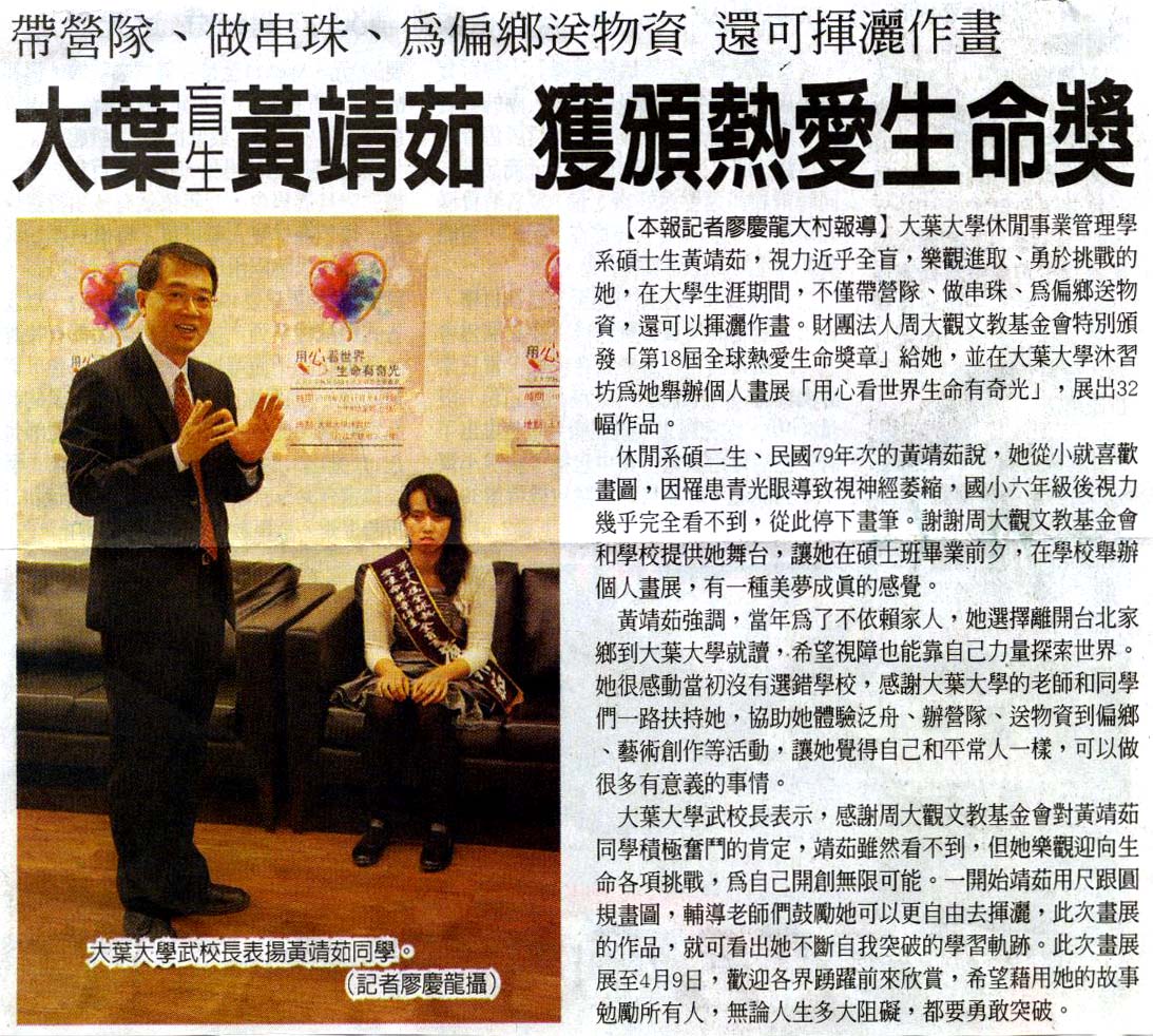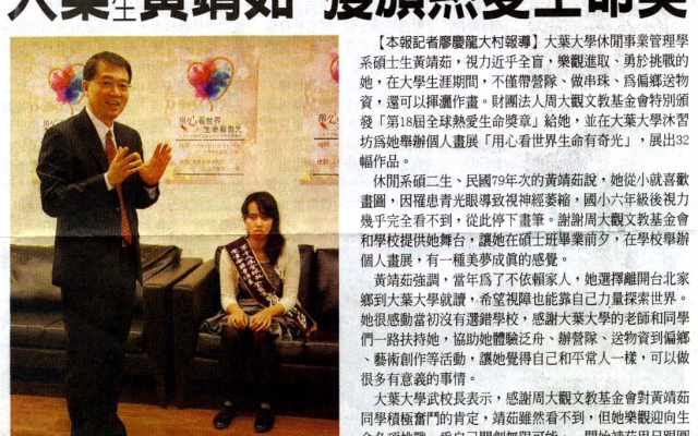大葉盲生黃靖茹 獲頒熱愛生命獎