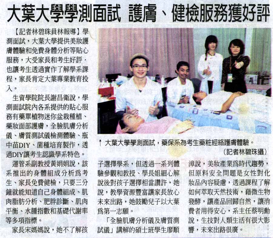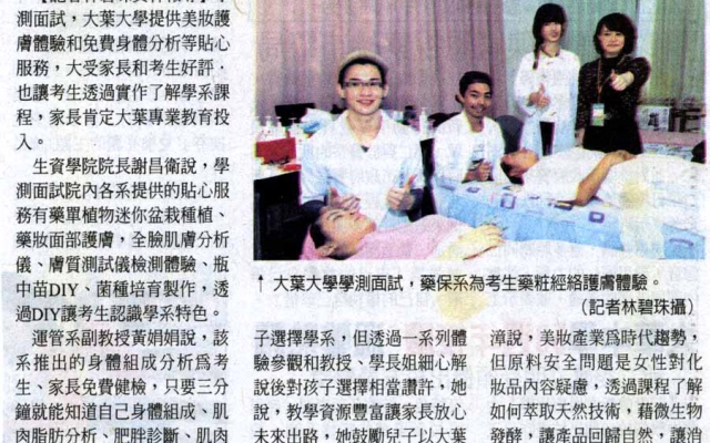 大葉大學學測面試 護膚、健檢服務獲好評