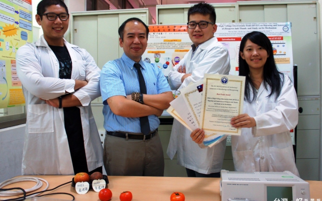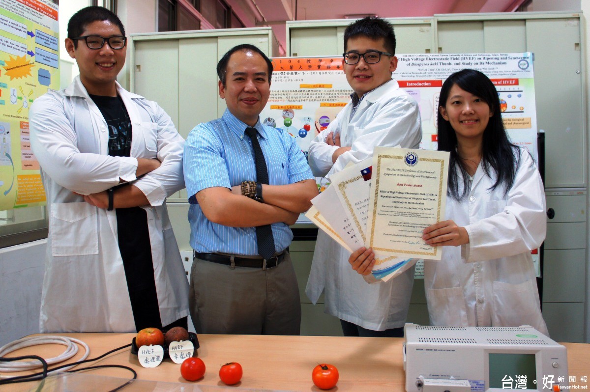 大葉大學生物科技暨資源學院院長謝昌衛帶領藥用植物與保健學系學生,歷時一年研發「利用高壓靜電場處理紅柿探討其成熟老化中的機制」,利用高壓靜電場改變電位,產生生物電流,可以延長水果保存期限、提高農產品外銷競爭力的效益,榮獲「2015生物技術暨生物工程國際研討會」最佳海報獎,21日分享這一份傑出研究。