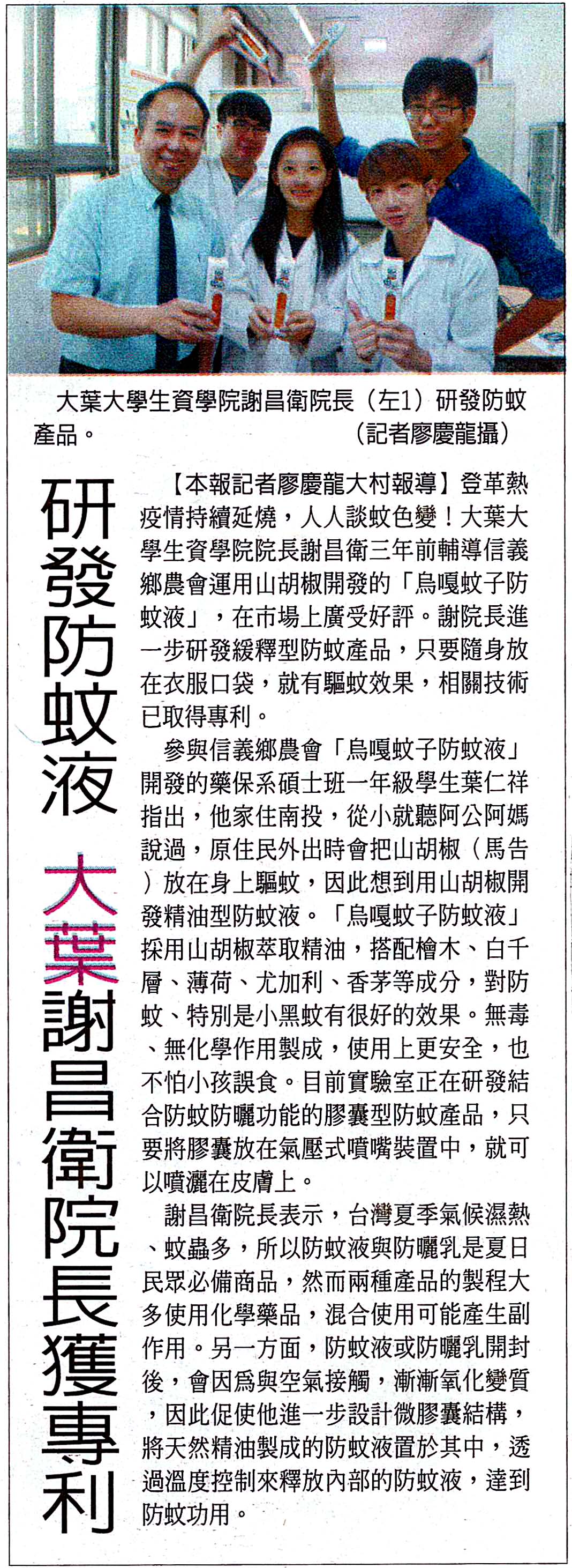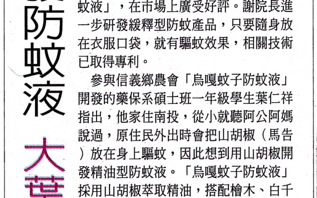 上一則:大葉研發防蚊液 獲專利、好評