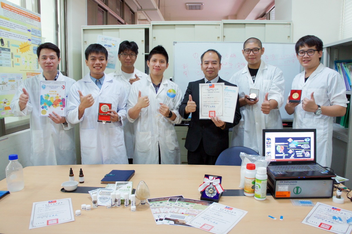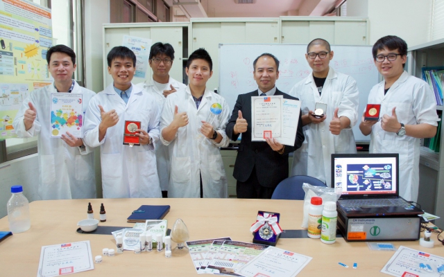 謝昌衛進一步說,指導張兆凱、莊景荃、劉啟恩、蔡宗儒發明的「一種新穎且快速檢測有機氯農藥之檢驗技術-有機氯選擇薄膜及其製備方法」,是以電化學原理設計,針對有機氯農藥的快篩平台,獲頒烏克蘭國際發明展金牌。陳頤安、林佳緯、周志翰、阮晟良跟他開發的「高分子模板-高效純化藥用真菌珍稀三帖類之技術」,以生技方式分離化合物,提升量化生產效率,獲波蘭國際發明展金牌。
