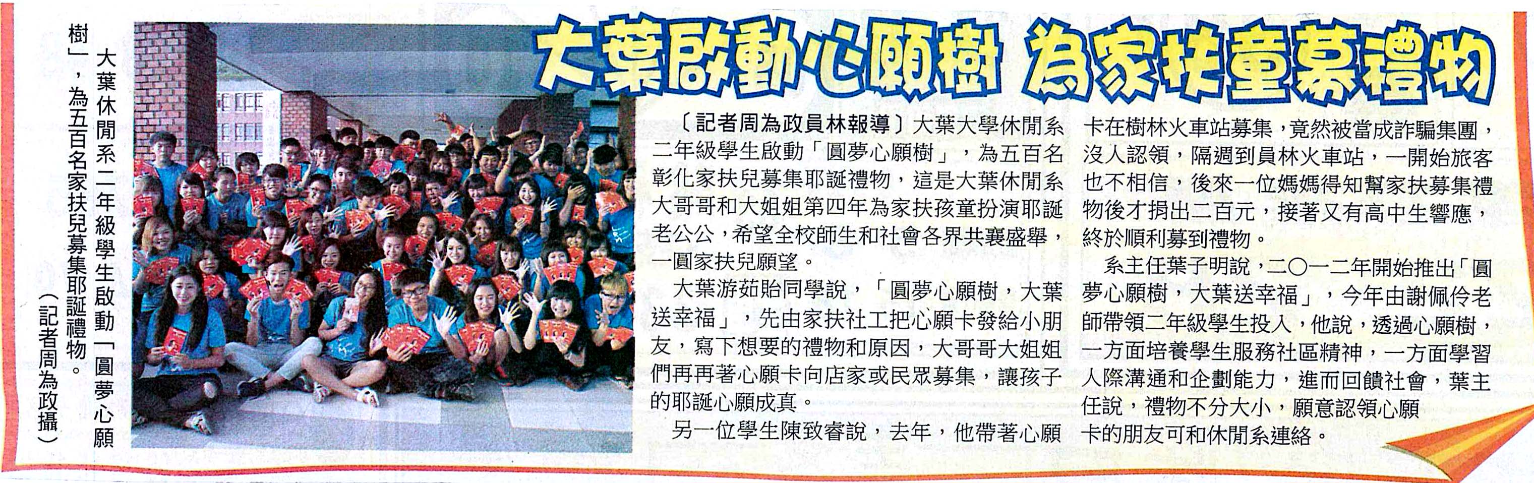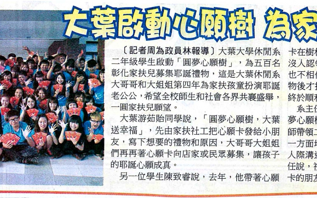 上一則:大葉大學圓夢心願樹 為家扶兒圓夢