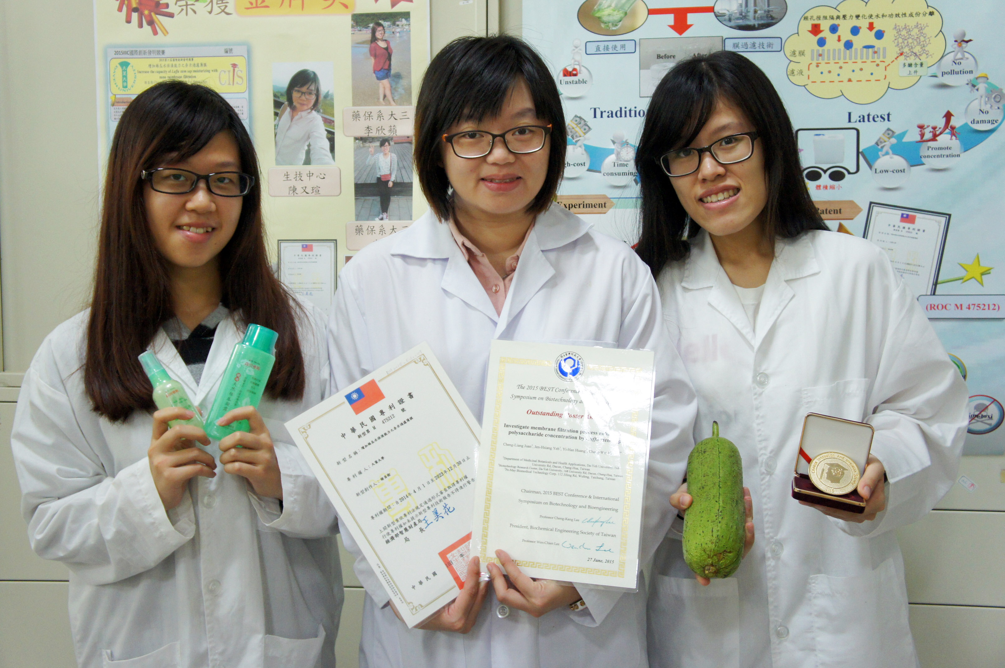 大葉大學〈Da-Yeh University〉生物科技暨資源學院院長謝昌衛帶領學生陳又瑄、李欣蘋、李旻研發「增加絲瓜水保濕能力之奈米過濾薄膜」,透過薄膜技術進行濃縮,增加保濕度同時減少運送過程的耗能,不僅取得專利,更將技術轉移森田生醫。