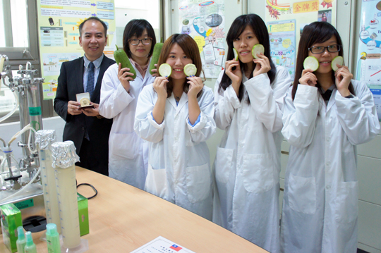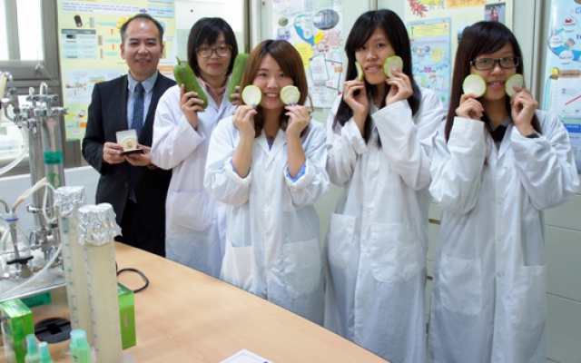 大葉大學生技暨資源學院院長謝昌衛帶領學生陳又瑄、李欣蘋、李旻研發「增加絲瓜水保濕能力之奈米過濾薄膜」,透過薄膜技術進行濃縮,增加保濕度同時減少運送過程的耗能,不僅取得專利,更將技術轉移森田生醫。
