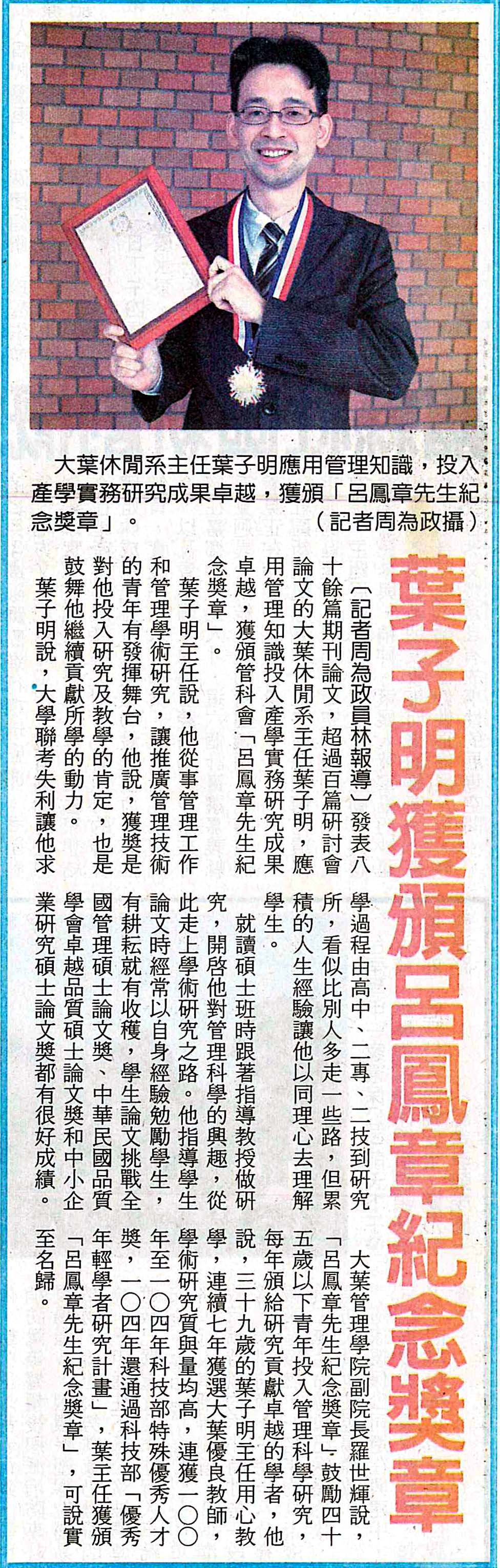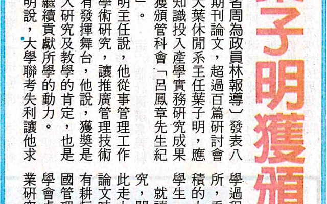 上一則:大葉休閒系主任葉子明 獲呂鳳章先生紀念獎章