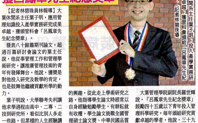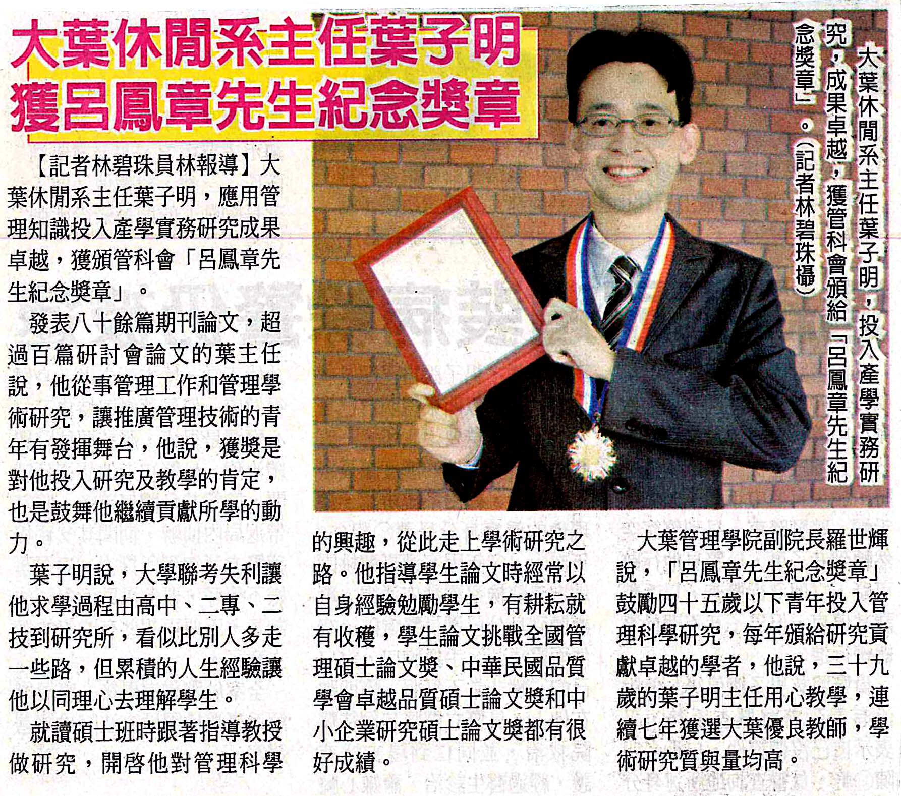 大葉休閒系主任葉子明 獲呂鳳章先生紀念獎章