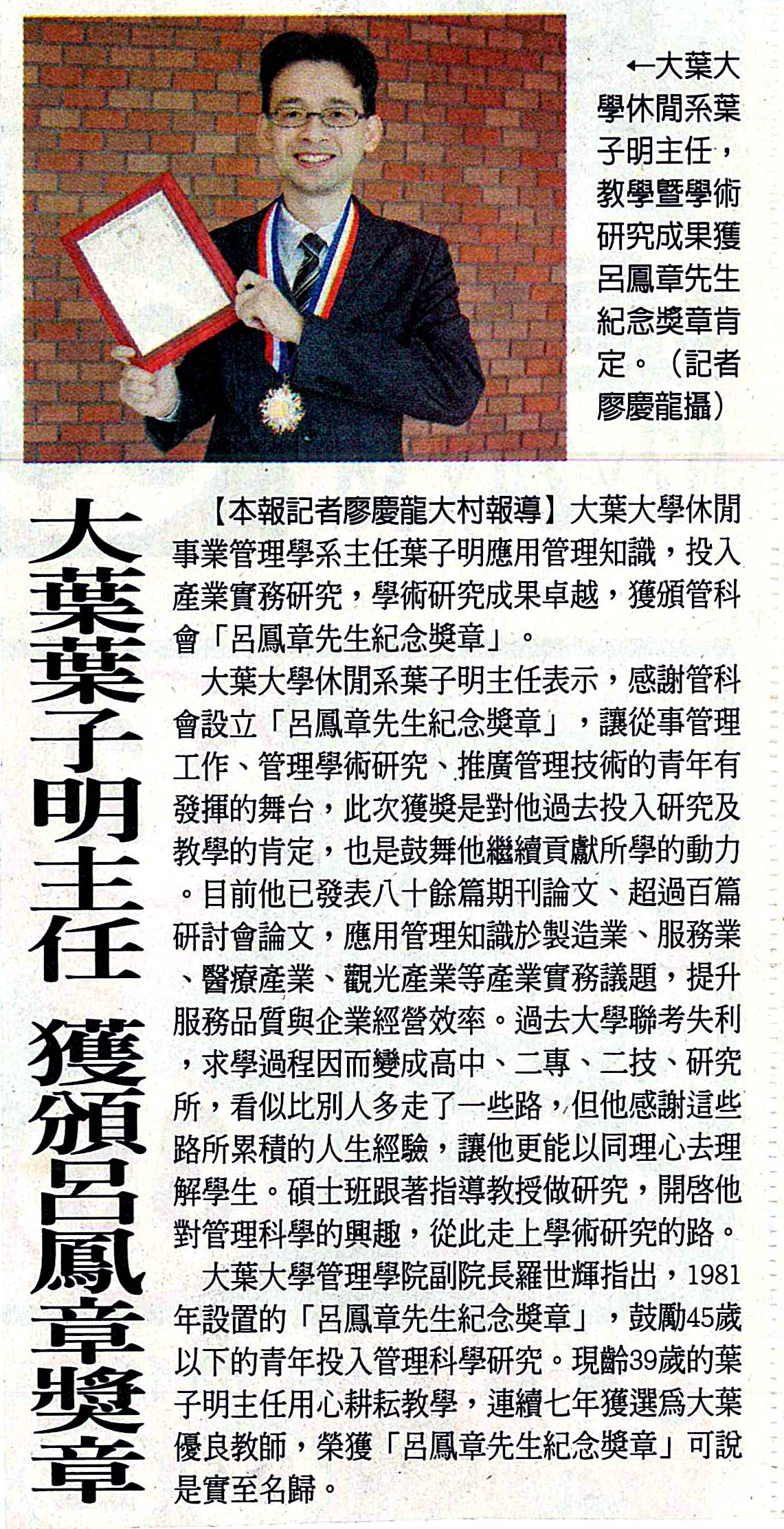 大葉大學葉子明主任 獲頒呂鳳章獎章