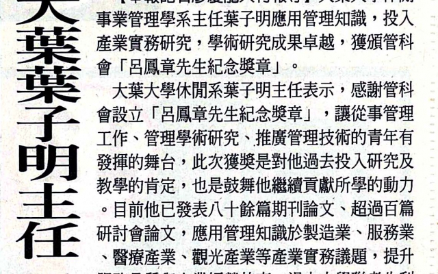 下一則:大葉休閒系主任葉子明 獲呂鳳章先生紀念獎章