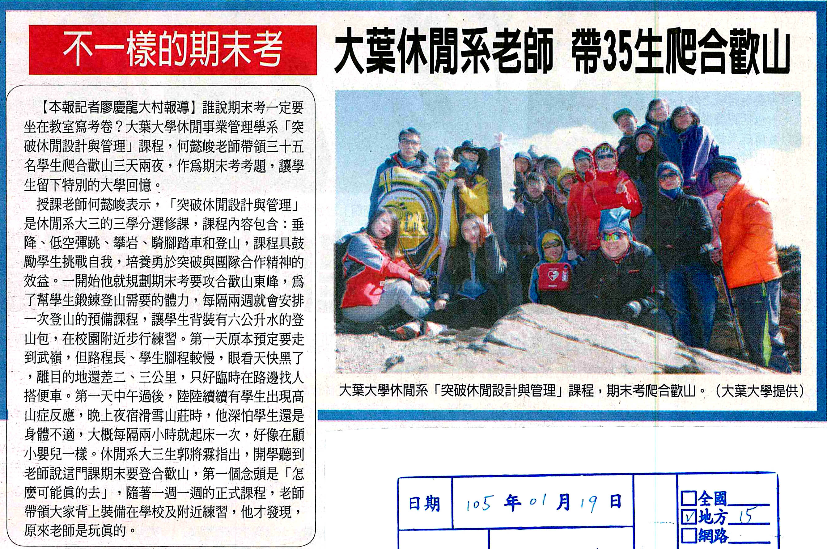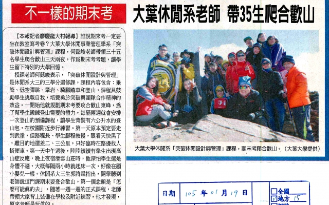 不一樣的期末考 大葉休閒系老師 帶35生爬合歡山