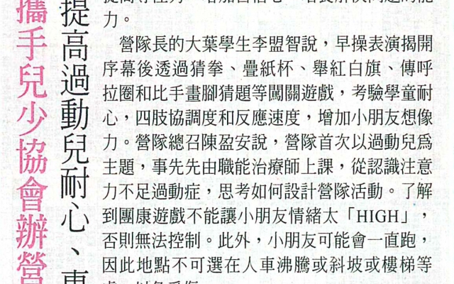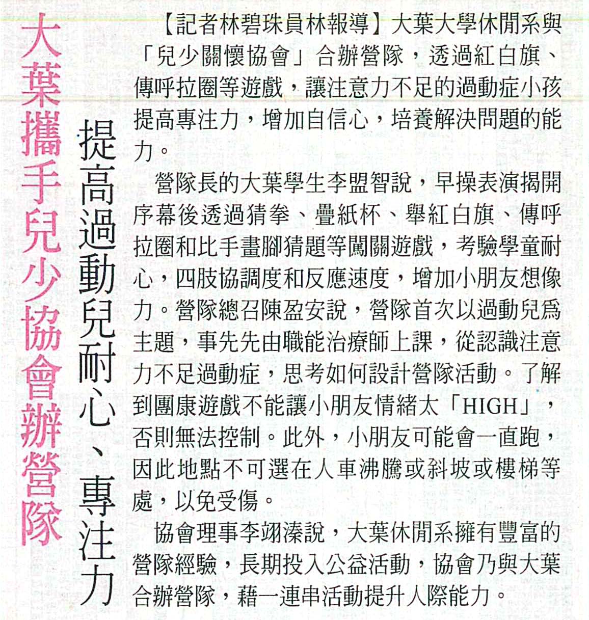 大葉攜手兒少協會辦營隊 提高過動兒耐心、專注力