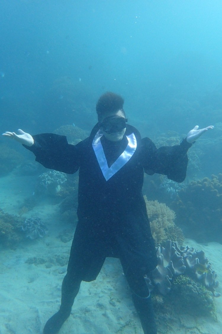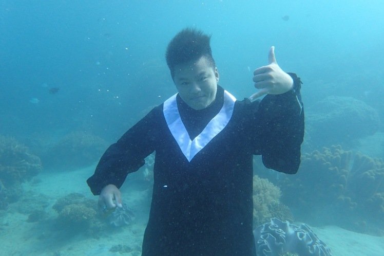 最狂畢業照!大學生已是潛水教練 穿學士服潛水拍照