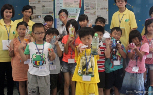 營隊活動長、休閒系大二的邱淑宜指出,他們設計了可體驗環保手作的「阿紙周遊列國」,共有三個關卡,分別是紙國、塑膠國、容器國。紙國會先告訴小朋友紙張用途及回收方式,比如:衛生紙是不可以回收的,紙張如果有釘書針、迴紋針,回收前要拆除……接著教小朋友用廢紙折垃圾袋。塑膠國教學員認識寶特瓶上的三角形編碼,不同號碼代表耐熱程度,同時帶領孩子們用寶特瓶跟氣球做玩具空氣砲。容器國則介紹鋁箔包、餐盒等,在紙類上面塗了特殊薄膜的可回收容器,並教小朋友用鋁箔包做小信封袋。
