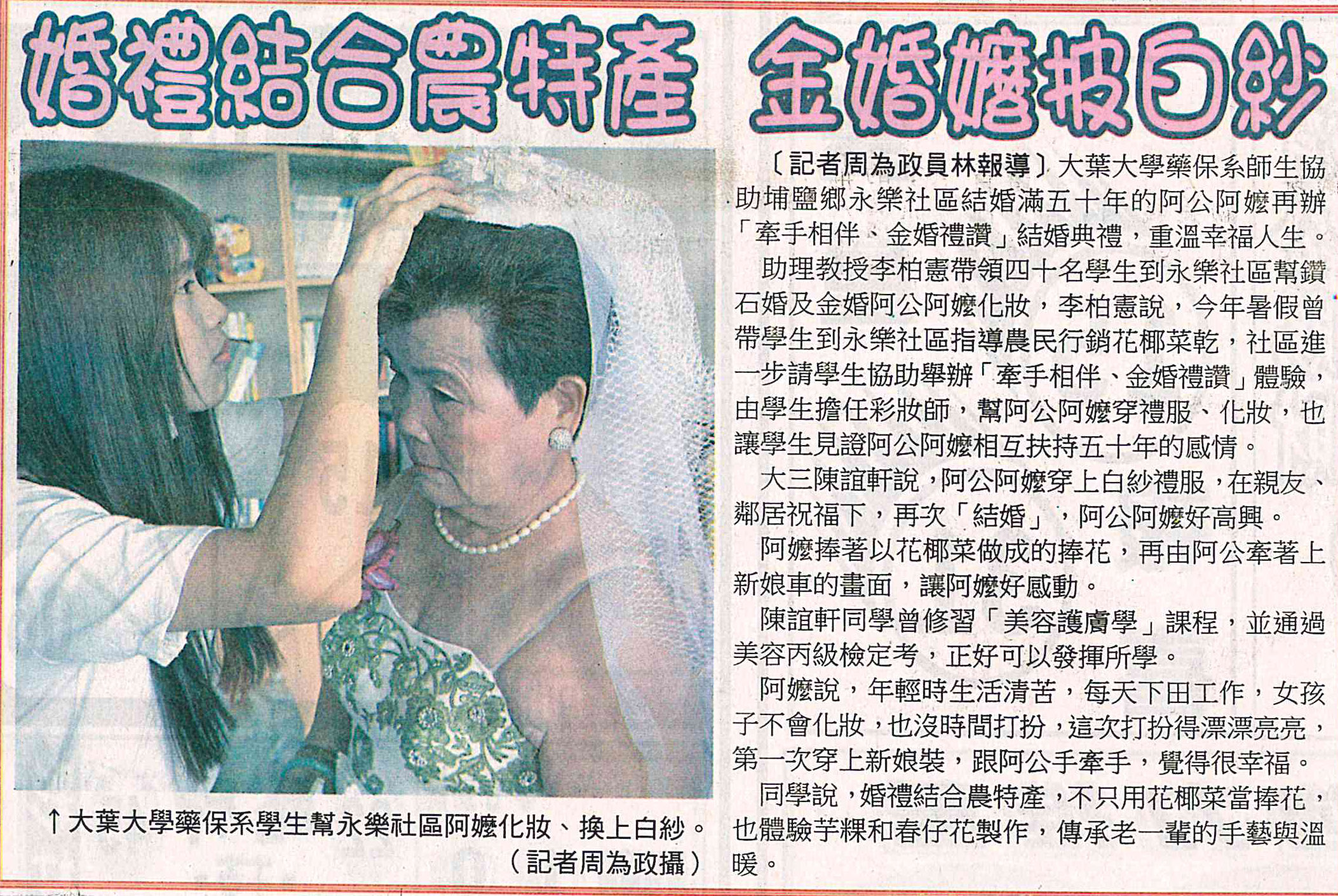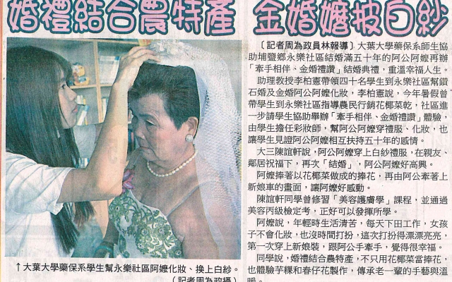 下一則:老阿嬤重披婚紗 大葉大學新娘秘書體驗趣 金婚禮讚