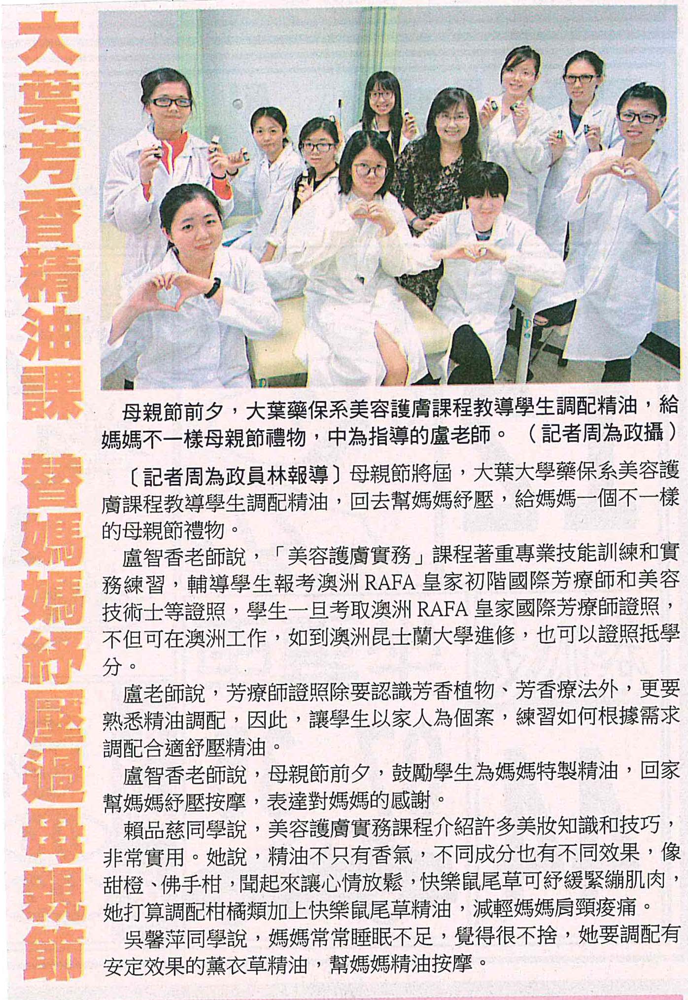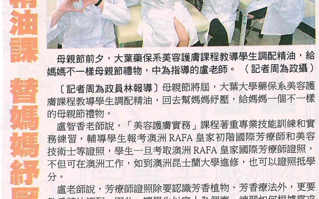 下一則:大葉大學藥保系美容護膚課程 學生調配精油要幫媽媽舒壓