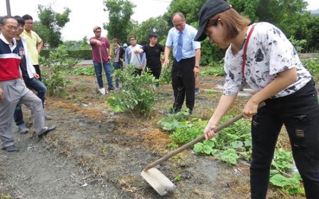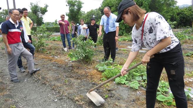 賴薏雯來自台北市,在都市從小沒有接觸過農地,拿鋤頭是頭一回。跟著蔡文琳拿鋤頭鋤草,她說,真的蠻累的。