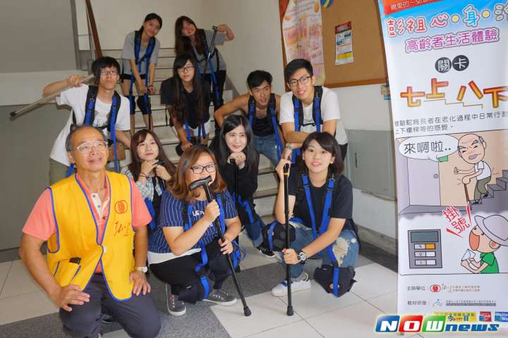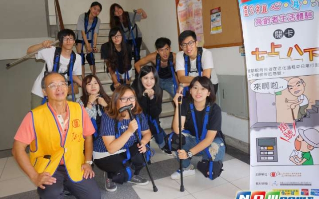 原來老了是這種感覺!大葉大學休閒事業管理學系助理教授謝佩伶的「團體動能」課程,7日邀請弘道老人福利基金會舉辦「彭祖體驗」活動,讓56名學生體驗高齡者的生活,希望他們能將心比心,了解長輩需求。