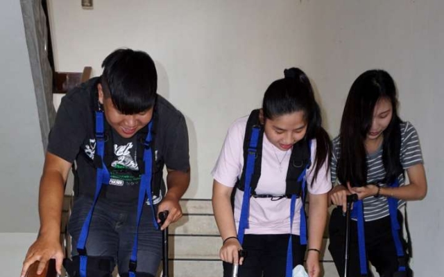 授課老師謝佩伶指出,「彭祖體驗」共有四個關卡,「七上八下」讓學生穿戴特殊裝備爬樓梯,模擬駝背、膝蓋無力的行動困難;「另眼相看」讓學生戴上有黃色色膜的眼罩看門診單,感受老年人視線模糊的問題;「手到擒來」讓學生戴手套,挑戰拿筷子夾豆子,模擬關節退化的不便;最後則是手腳綁上鉛塊跳健康操,體驗肌力弱化的情況。