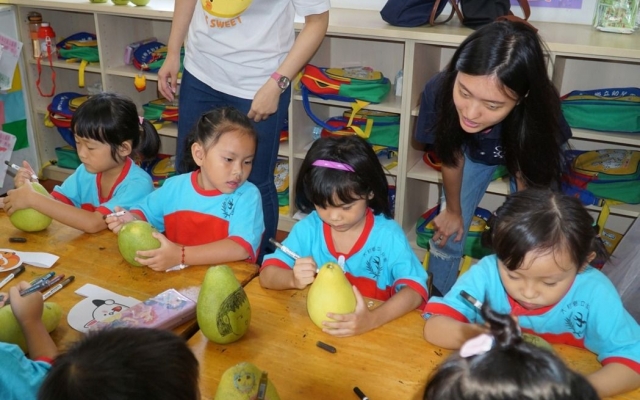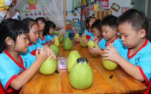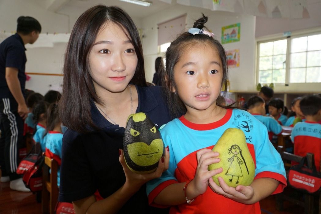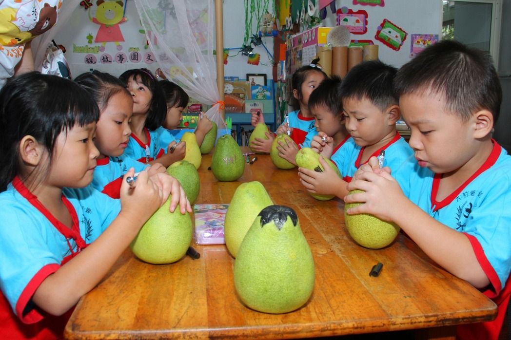 謝佩伶說,每年這個季節是柚子盛產期,又大又圓的柚子是圓滿的象徵,「柚子」跟「遊子」諧音,有回家團圓的意義,因此也安排「畫柚子」活動,帶領小朋友在柚子上畫自己喜歡的卡通人物或是表情,把可愛的柚子帶回家跟全家人一起分享。