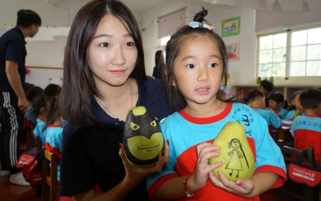 丁小妹妹在柚子上畫了公主,她說,最喜歡畫畫了,這是第一次把柚子皮當圖畫紙,還可以塗上各種顏色,很新鮮、很好玩。