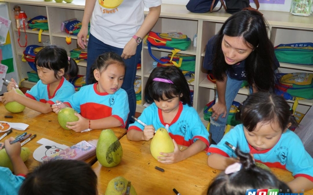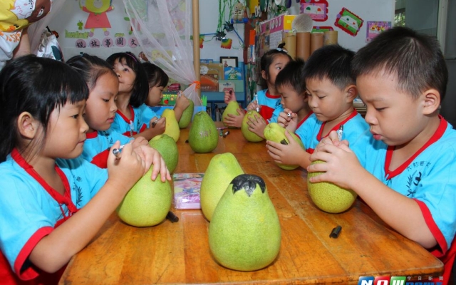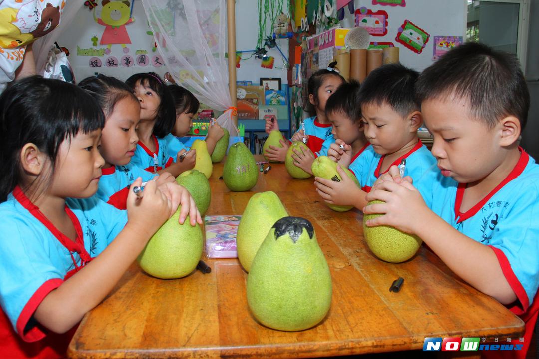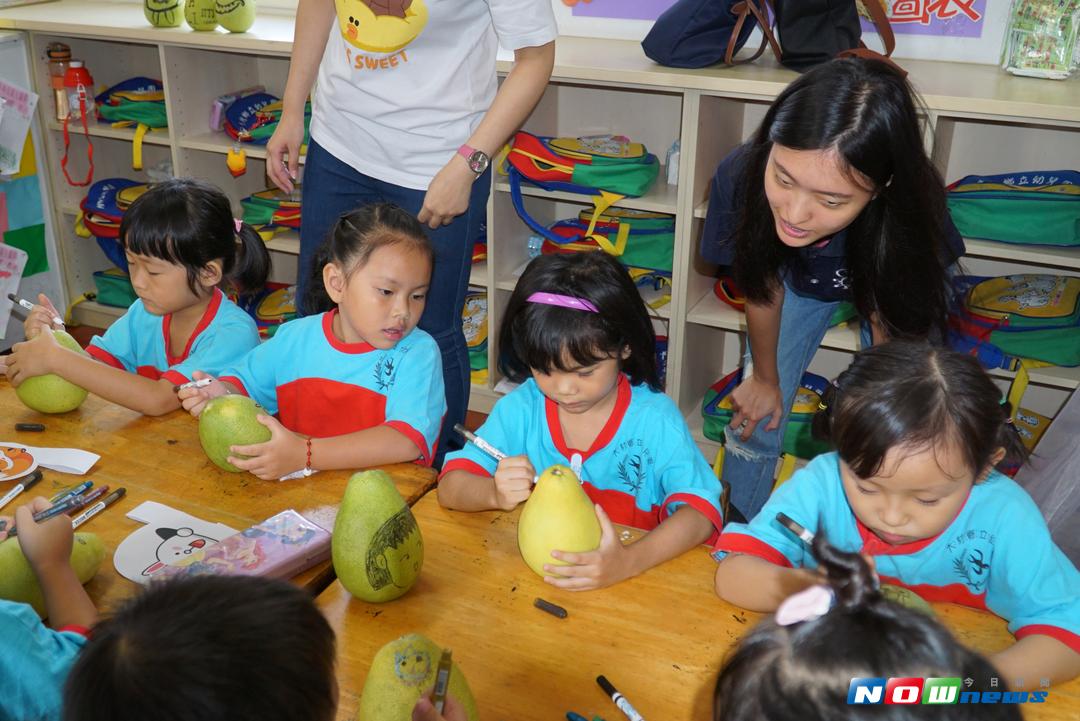 九月、十月正好是柚子的盛產期,又大又圓的柚子是圓滿的象徵,此外,「柚子」跟「遊子」諧音,有回家團圓的意義,因此他們也安排了「畫柚子」活動,帶領小朋友在柚子上畫自己喜歡的卡通人物或是表情,把可愛的柚子帶回家跟全家人一起分享。