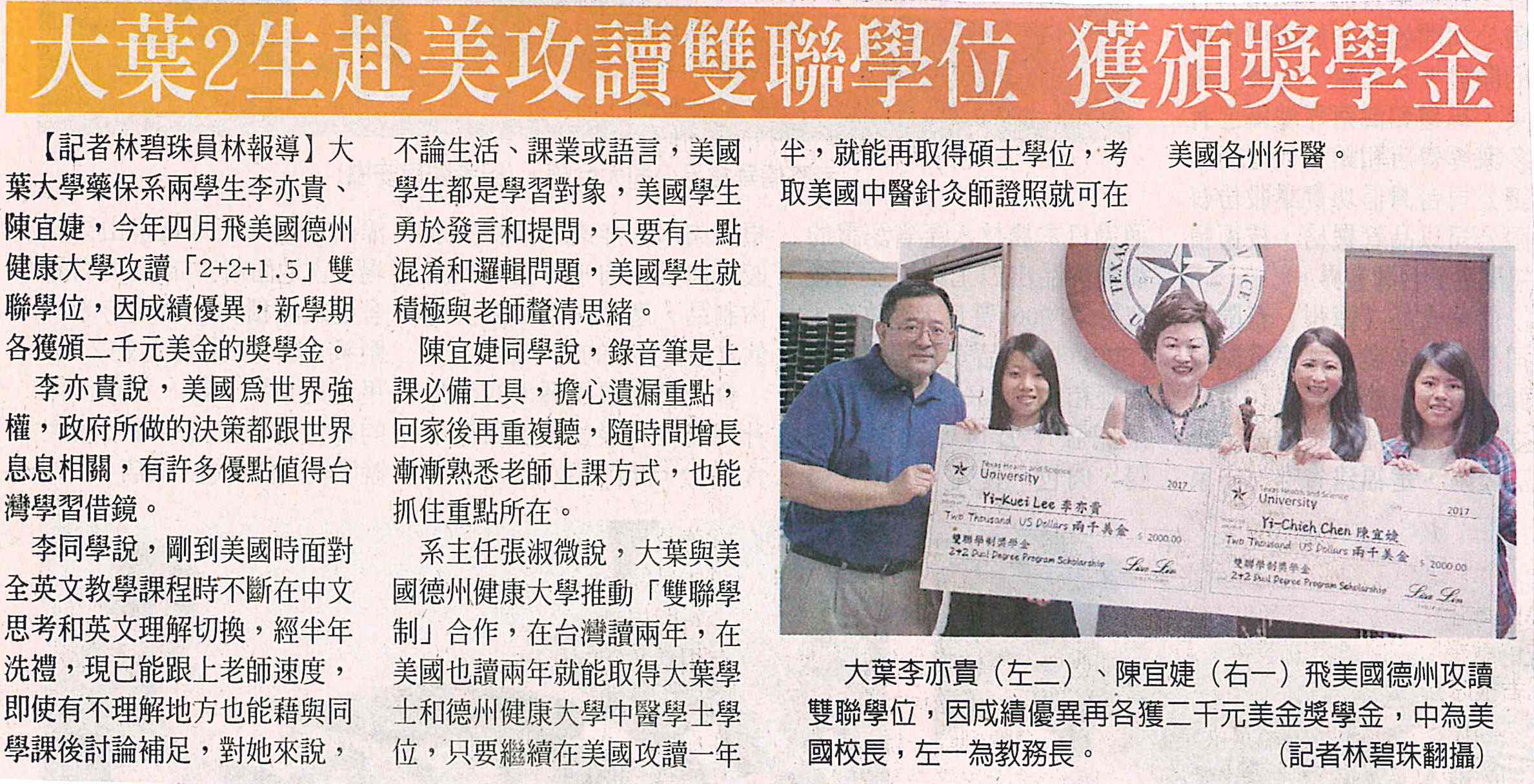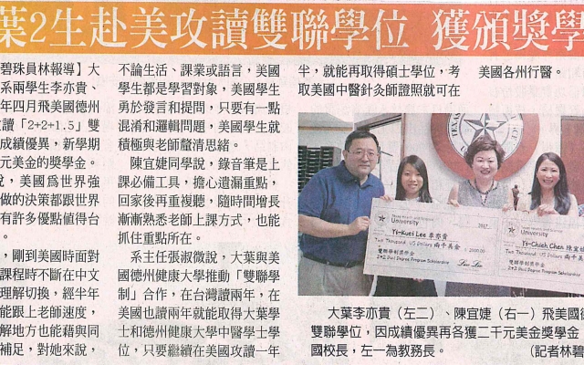 大葉2生赴美攻讀雙聯學位 獲頒獎學金