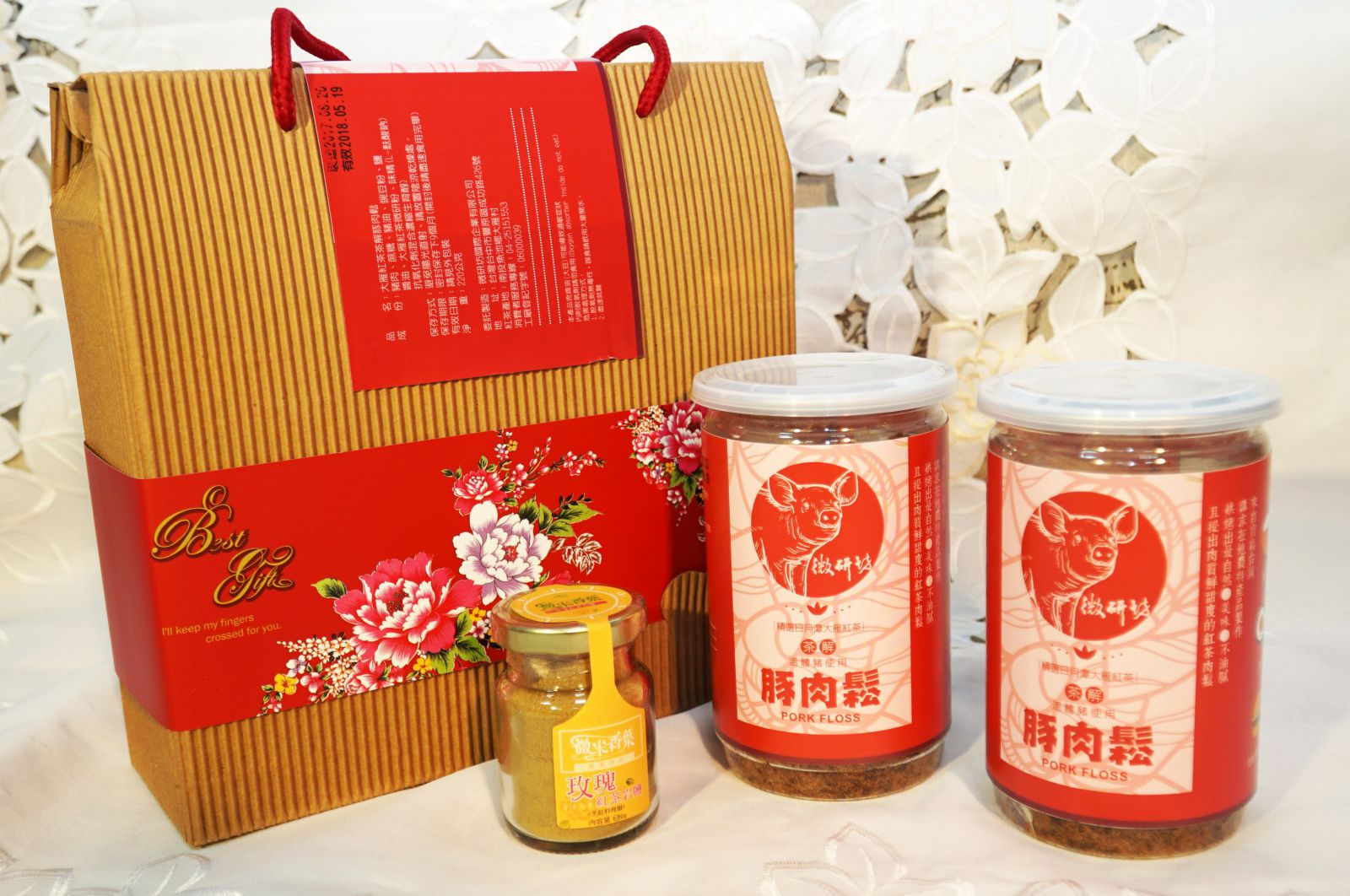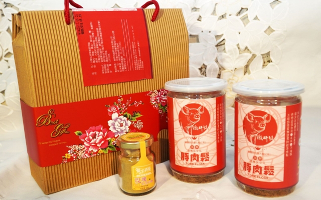 「大雁紅茶茶解肉鬆」搭配年節推出肉鬆禮盒,內含兩罐肉鬆和一罐玫瑰紅茶岩鹽,兩項產品都將高品質台灣茶葉研磨成小分子,添加到產品中,保留茶葉原本營養素。
