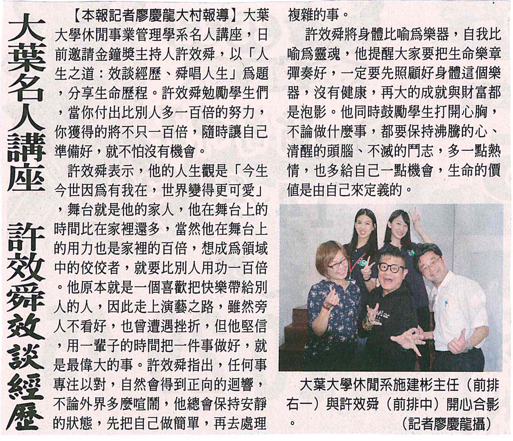 上一則:大葉大學休閒系名人講座 許效舜暢談人生之道