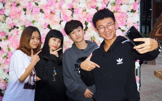 學生開心自拍聖誕節腳步越來越接近,大葉學生會在管理學院中庭佈置聖誕藝術,給校園增添聖誕氣氛,不只有LED聖誕樹,點亮夜晚的美麗,還有一面粉紅色花牆,吸引學生自拍。