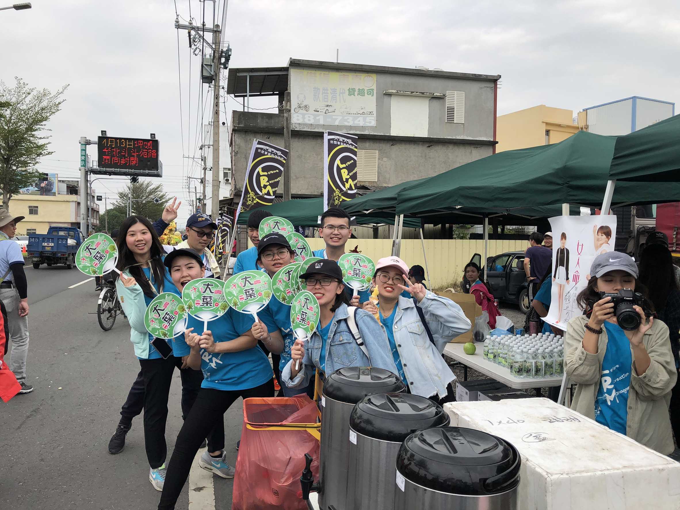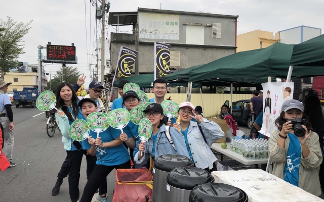 師生在一五○縣道旁,打造「大葉點心站」服務香客,提供扇子、水、飲料、冰棒等服務。除了物資的供應,他們也帶著垃圾袋,沿途幫忙撿垃圾、回收分類,為環保盡一分心力。
