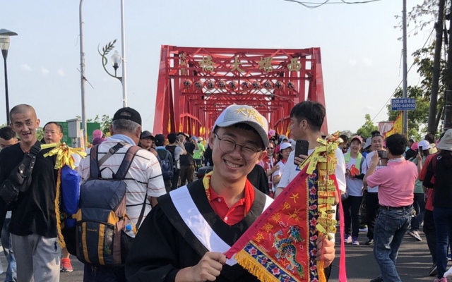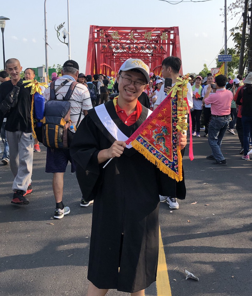 張崇瑜同學說,大甲媽進香是世界三大宗教盛事,媽祖也是他的信仰,從小到大觀看大甲媽進香隊伍經過他家附近,因此決定加入服務香客行動,他說,從大一開始跟隨大甲媽祖,今年大四,特別帶著學士服去拍照留念。