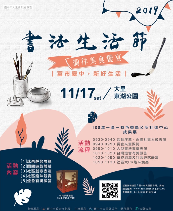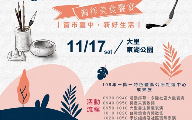 大葉大學休閒事業管理學系助理教授林擎天連續三年執行臺中市大里區公所「一區一特色暨區域型社造中心計畫」,輔導當地結合書法文化、美食、觀光等資源,發展社區特色,將於17日星期天上午9點至12點,在臺中市大里東湖公園舉辦「書法生活節~徜徉美食饗宴」,展出社區營造成果,歡迎民眾前往參加。
