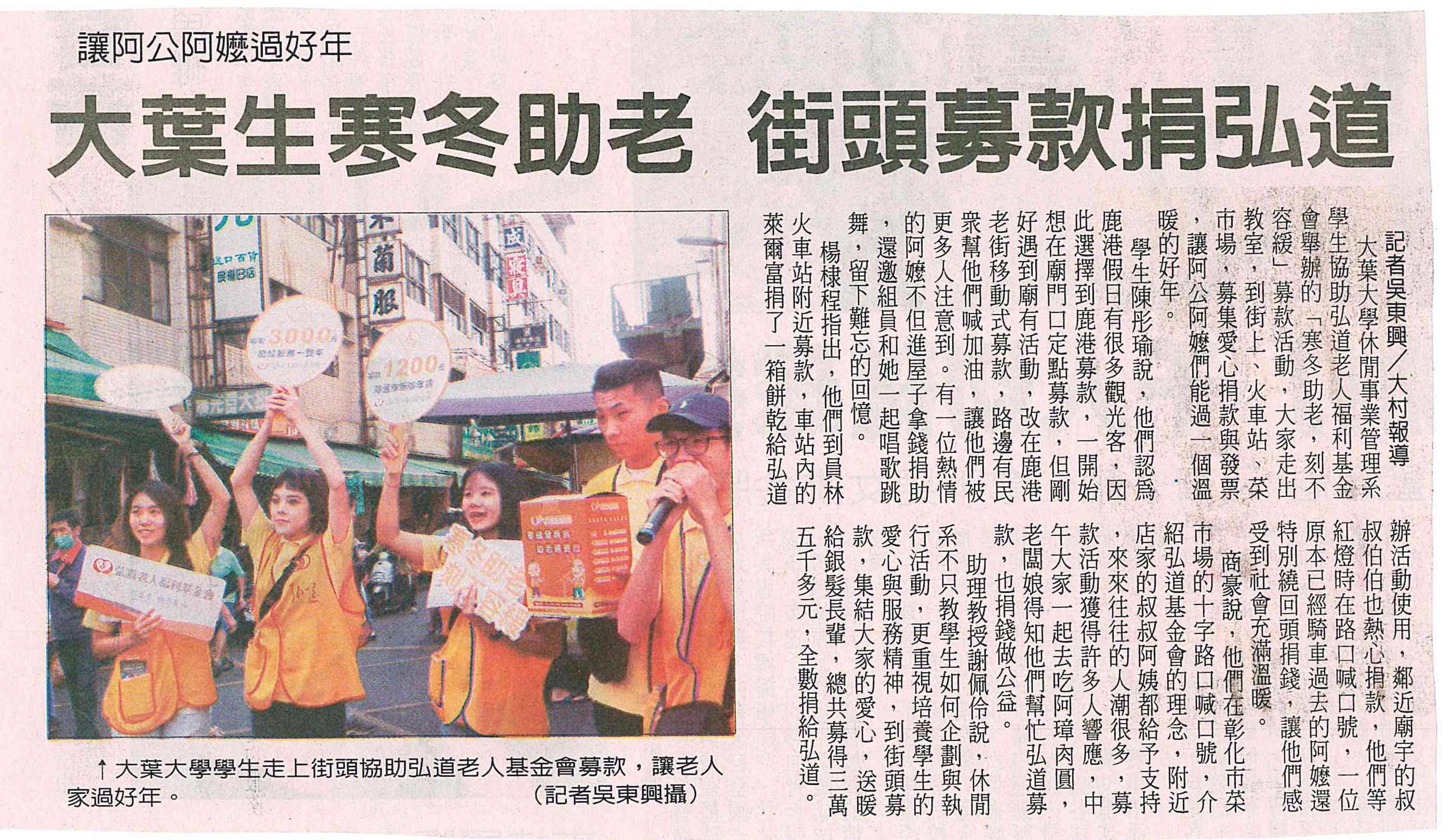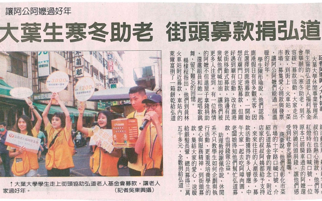 下一則:大葉休閒系師生街頭募款 讓弘道獨居阿公阿嬤過好年