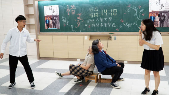 休閒系助理教授謝佩伶指出,「團體動能」是指一個社會團體形成的原因,及維繫團體功能的力量或方式,休閒系不只是教學生如何企劃與執行活動,更引導學生培養愛心與服務精神,發掘自己在團體活動中可以發揮什麼作用。課程特別結合服務學習,帶領學生發想銀髮劇,在校內演出給阿公阿嬤看,銀髮劇「惜夢」也會走出校園,與弘道老人福利基金會合作,到社區據點演出。